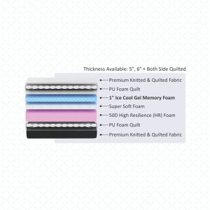 Premium Knitted & Quilted Fabric + PU Foam Quilt + 1″ Ice Cool Gel Memory Foam + Super Soft Foam + 50D HR Foam + PU Foam Quilt + Premium Knitted & Quilted Fabric