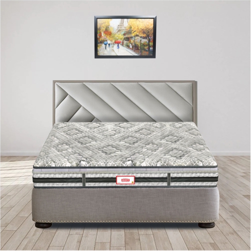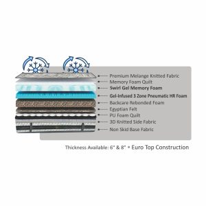 Premium Melange Knitted Fabric + Cool Gel Memory Foam + 3 Zone Pneumatic HR Foam + Backcare Rebounded Foam + Egyptian Felt + PU Foam Quilt + 3D Knitted Side Fabric + Non Skid Base Fabric