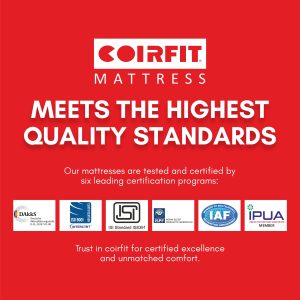 Coirfit products have been tested and certified complaintย with the demanding standards of ten leading certification programs-Dakks, ISI, ISO, ISPF, IAF and many more. The highest standard possible, guaranteeing that the foam is safe for babies and children.